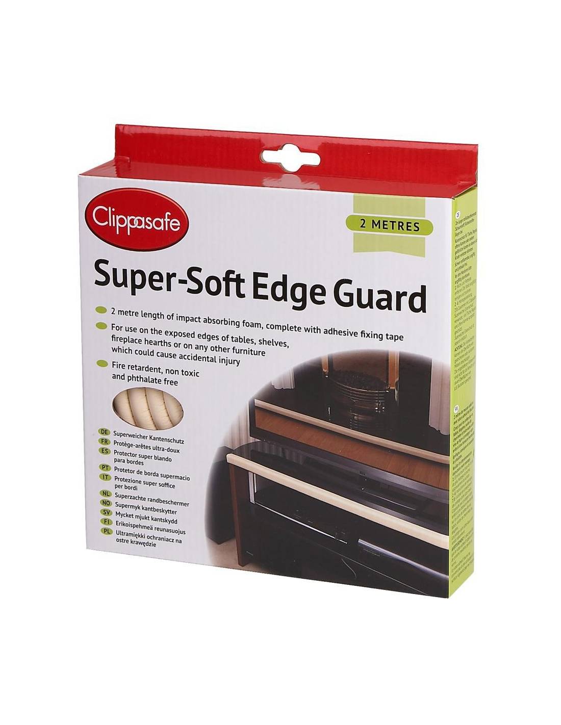 Super Soft Edge Guard viene en longitudes de 2 metros de material protector que absorbe impactos que se puede cortar a cualquier longitud deseada y usarse en los bordes afilados de mesas, estantes y hogares de chimeneas.
